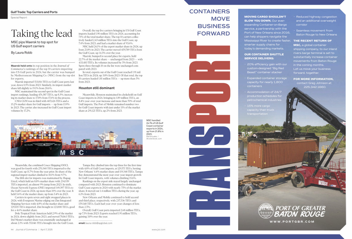 Maersk held onto its top position in the Journal of Commerce’ s rankings of the top 10 carriers importing into US Gulf ports in 2024, but the carrier was bumped by Mediterranean Shipping Co.( MSC) from the top slot for exports.