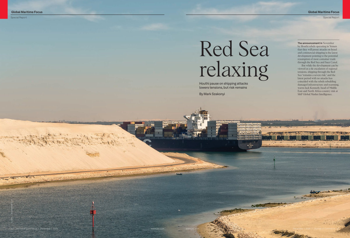 But while the development can be viewed as a de-escalation of regional tensions, shipping through the Red Sea“ remains a severe risk,” and the latest period with no attacks has coincided with the rebels rebuilding damaged infrastructure and rearming, warns Jack Kennedy, head of Middle East and North Africa country risk at S & P Global Market Intelligence. www. joc. com December 1, 2025 | Journal of Commerce 21