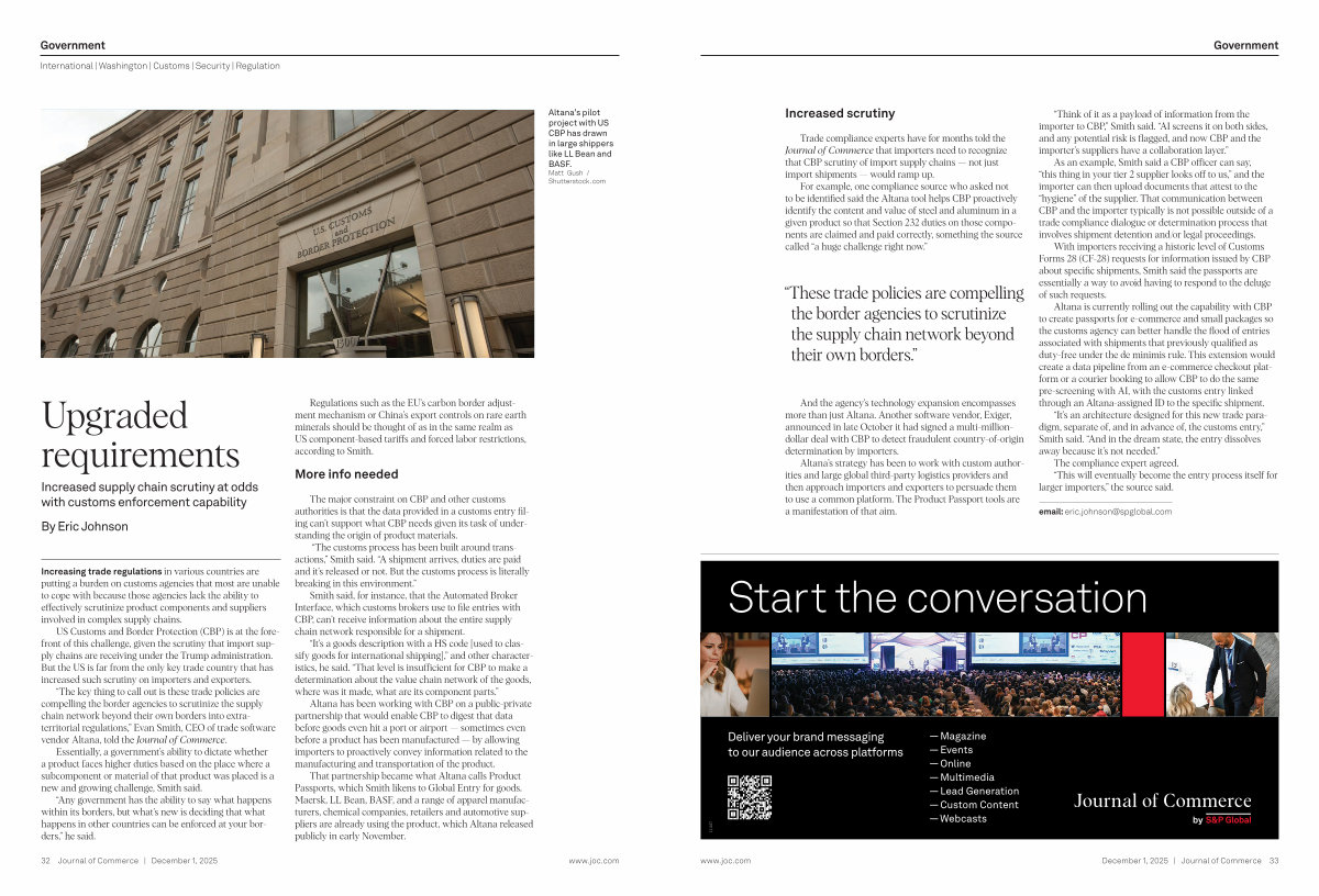 “ The key thing to call out is these trade policies are compelling the border agencies to scrutinize the supply chain network beyond their own borders into extraterritorial regulations,” Evan Smith, CEO of trade software vendor Altana, told the Journal of Commerce.
