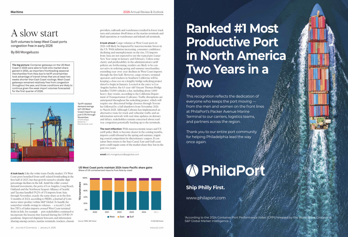 The big picture: Container gateways on the US West Coast in 2025 were able to hold onto market share gained in 2024, as importers frontloading seasonal merchandise from Asia due to tariff uncertainties took advantage of transit times that are at least two weeks shorter than East Coast routings. West Coast gateways remained relatively free from congestion throughout the year, and those conditions are likely to continue given the weak import volumes forecasted for the first quarter of 2026.