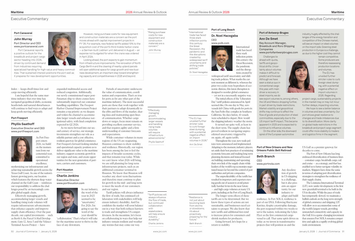 Throughout the year, new trade policies were announced and implemented. Adapting to the moment, industry players set aside their best practices of scrutinizing economic forecasts and making long-term planning decisions and instead focused on building, maintaining and operating their own link of the supply chain while leaders of the world’ s top economies negotiated issues far beyond the control of port authorities and private companies.