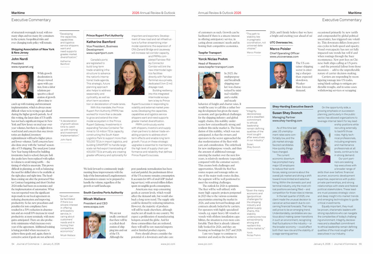 While growth deceleration is always viewed upon with caution, from a labor relations perspective a deceleration of growth allows time to catch up with training and investment implementation, which is always more difficult when we’ re trying to get ahead during the higher growth periods. As of this writing, the latest slate of US tariffs has not had a significant impact in New York and New Jersey on total year-overyear volumes, but there is a slight downward trend and concern that once inventories are depleted, inventory replenishment will lead to higher prices and lower volumes. Tariff concerns have also done away with the“ normal” seasonality of US shipping. The usual post-Lunar New Year bump followed by building inventories, back to school, then pre-holiday peaks have been replaced with spikes in volume to avoid rising tariffs— the timing of which is uncertain. This proves difficult in planning, as well as balancing the need for skilled labor to be available at the right place and right time. The headlines coming out after the protracted Master Contract bargaining and short October 2024 strike had been on economics and the implementation of automation. What was not reported were the significant steps made in our local agreement on reducing absenteeism and improving productivity. So far, new procedures and penalties for non-compliance have resulted in a 50 % reduction in absenteeism and an overall 10 % increase in vessel productivity at most terminals, with more gains anticipated. There are also productivity minimums which increase every year of the agreement. Additional training is being provided where necessary to achieve these goals and, again, there is corrective action if goals are not achieved.