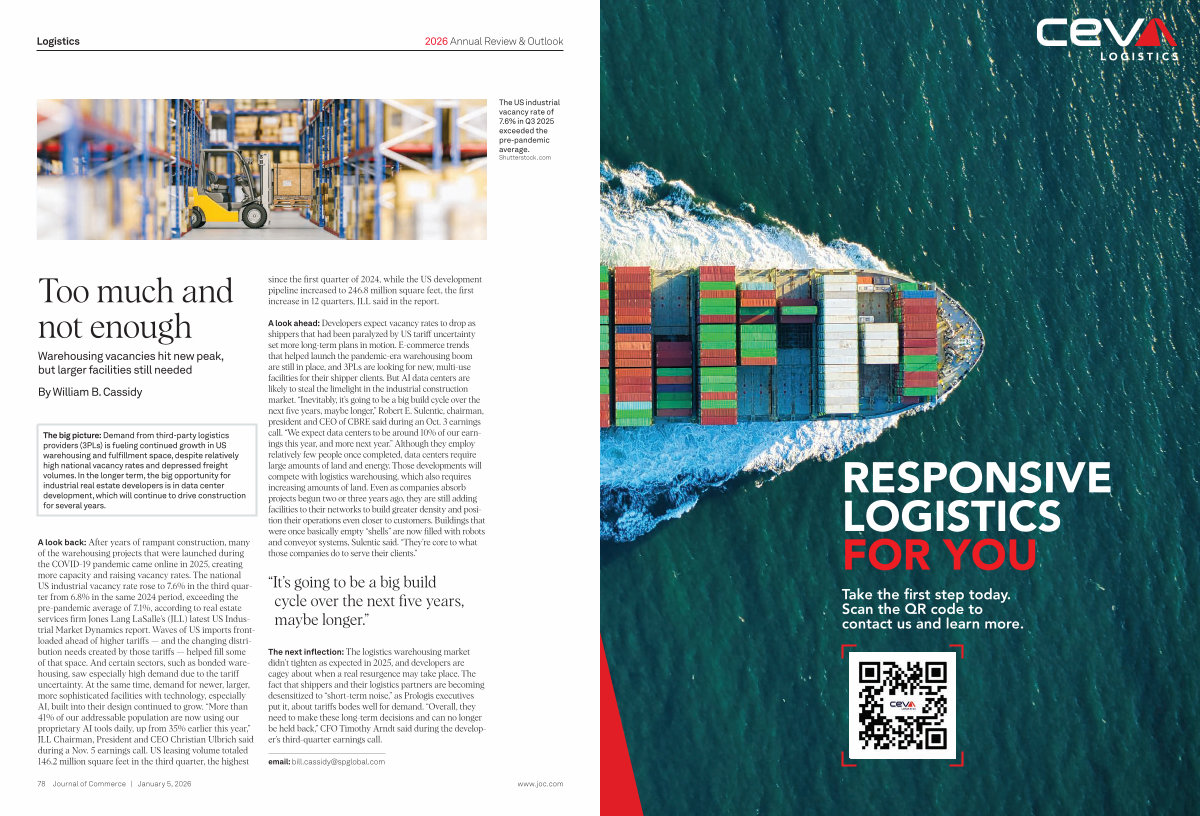A look back: After years of rampant construction, many of the warehousing projects that were launched during the COVID-19 pandemic came online in 2025, creating more capacity and raising vacancy rates. The national US industrial vacancy rate rose to 7.6 % in the third quarter from 6.8 % in the same 2024 period, exceeding the pre-pandemic average of 7.1 %, according to real estate services firm Jones Lang LaSalle’ s( JLL) latest US Industrial Market Dynamics report. Waves of US imports frontloaded ahead of higher tariffs— and the changing distribution needs created by those tariffs— helped fill some of that space. And certain sectors, such as bonded warehousing, saw especially high demand due to the tariff uncertainty. At the same time, demand for newer, larger, more sophisticated facilities with technology, especially AI, built into their design continued to grow.“ More than 41 % of our addressable population are now using our proprietary AI tools daily, up from 35 % earlier this year,” JLL Chairman, President and CEO Christian Ulbrich said during a Nov. 5 earnings call. US leasing volume totaled 146.2 million square feet in the third quarter, the highest since the first quarter of 2024, while the US development pipeline increased to 246.8 million square feet, the first increase in 12 quarters, JLL said in the report.