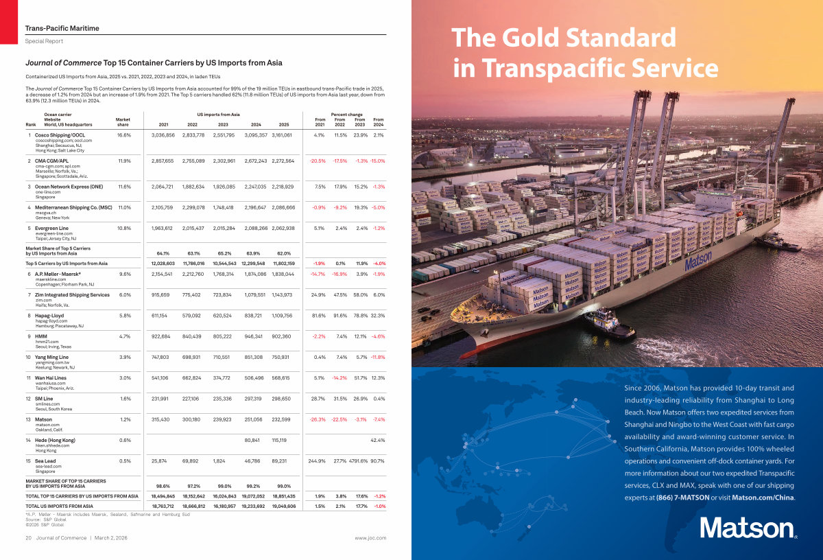 Since 2006, Matson has provided 10-day transit and industry-leading reliability from Shanghai to Long Beach. Now Matson offers two expedited services from Shanghai and Ningbo to the West Coast with fast cargo availability and award-winning customer service. In Southern California, Matson provides 100 % wheeled operations and convenient off-dock container yards. For more information about our two expedited Transpacific services, CLX and MAX, speak with one of our shipping experts at( 866) 7-MATSON or visit Matson. com / China.