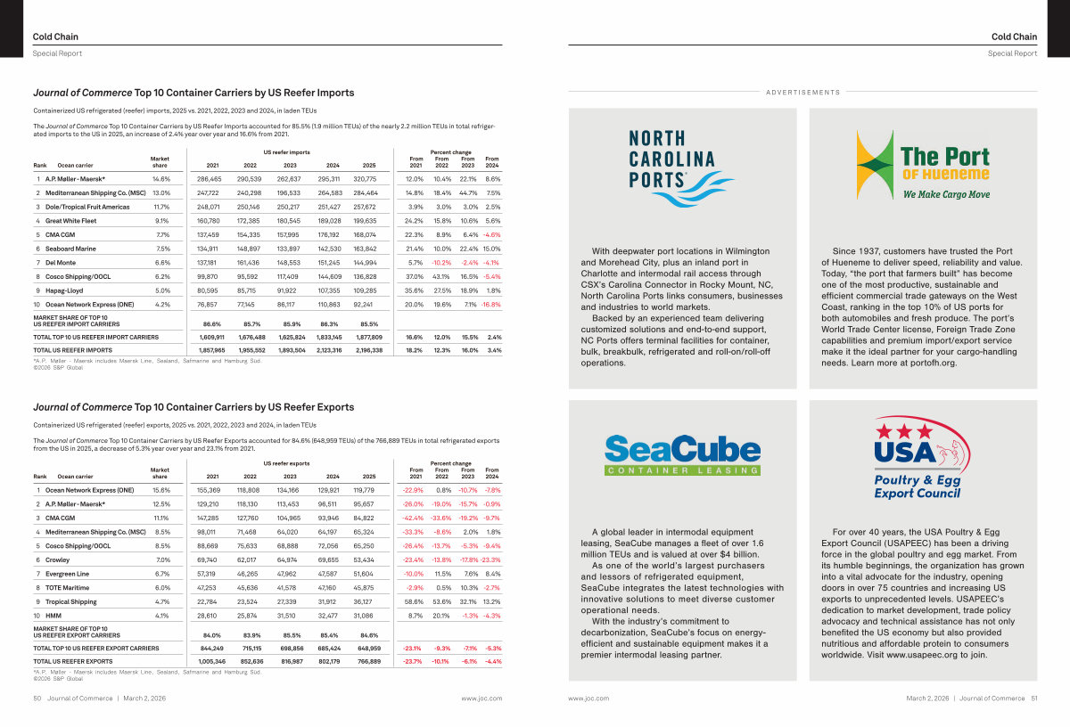 The Journal of Commerce Top 10 Container Carriers by US Reefer Imports accounted for 85.5 %( 1.9 million TEUs) of the nearly 2.2 million TEUs in total refrigerated imports to the US in 2025, an increase of 2.4 % year over year and 16.6 % from 2021.