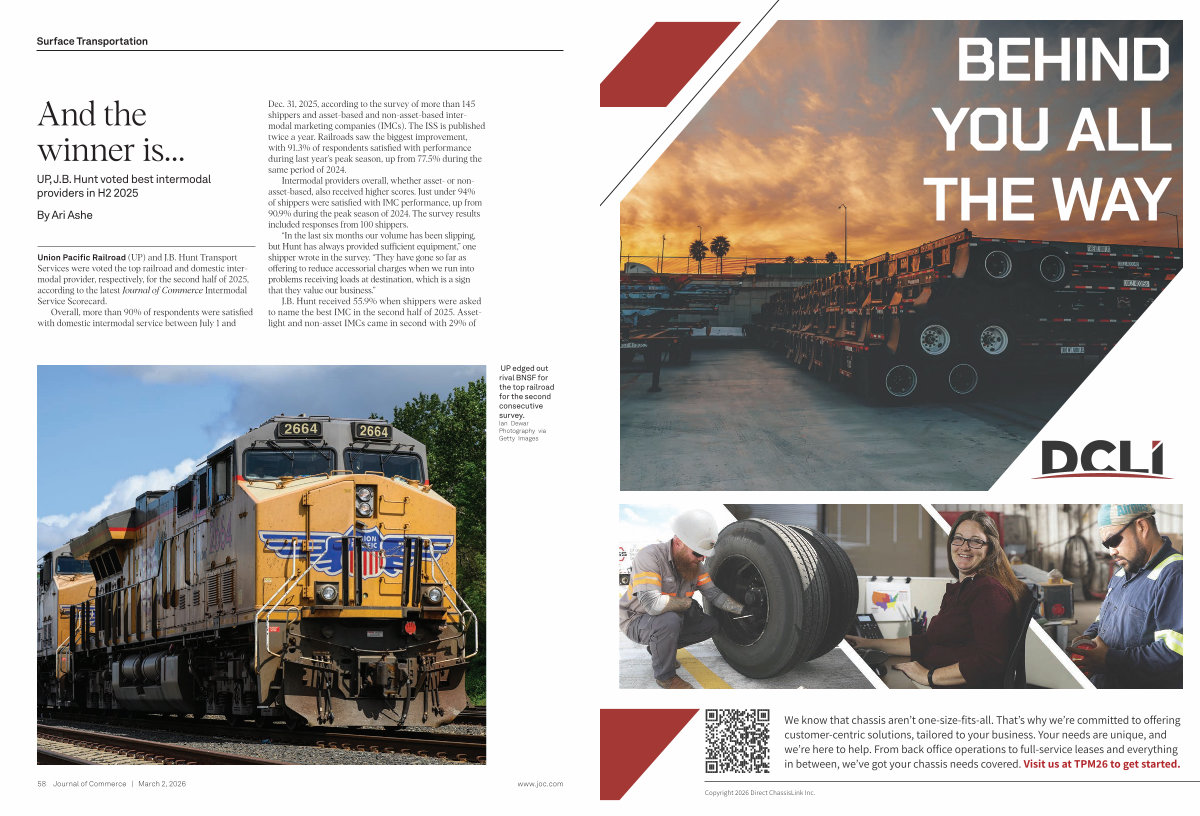 Union Pacific Railroad( UP) and J. B. Hunt Transport Services were voted the top railroad and domestic intermodal provider, respectively, for the second half of 2025, according to the latest Journal of Commerce Intermodal Service Scorecard.