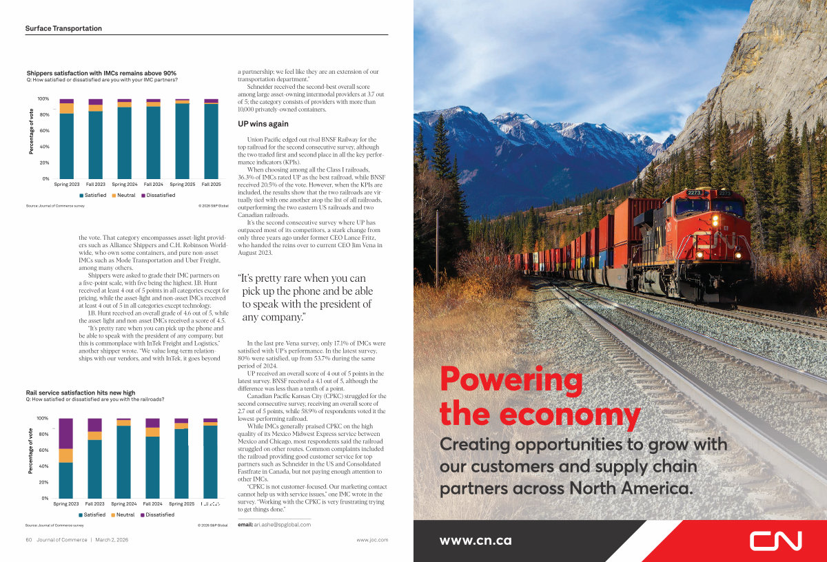 While IMCs generally praised CPKC on the high quality of its Mexico Midwest Express service between Mexico and Chicago, most respondents said the railroad struggled on other routes. Common complaints included the railroad providing good customer service for top partners such as Schneider in the US and Consolidated Fastfrate in Canada, but not paying enough attention to other IMCs.