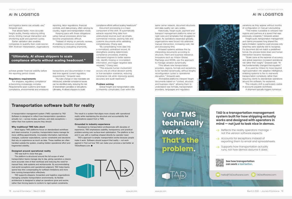 AI-enabled platforms interpret freight documents based on“ context, structure and business intent,” allowing them to understand new formats, transportation providers, languages and regulatory