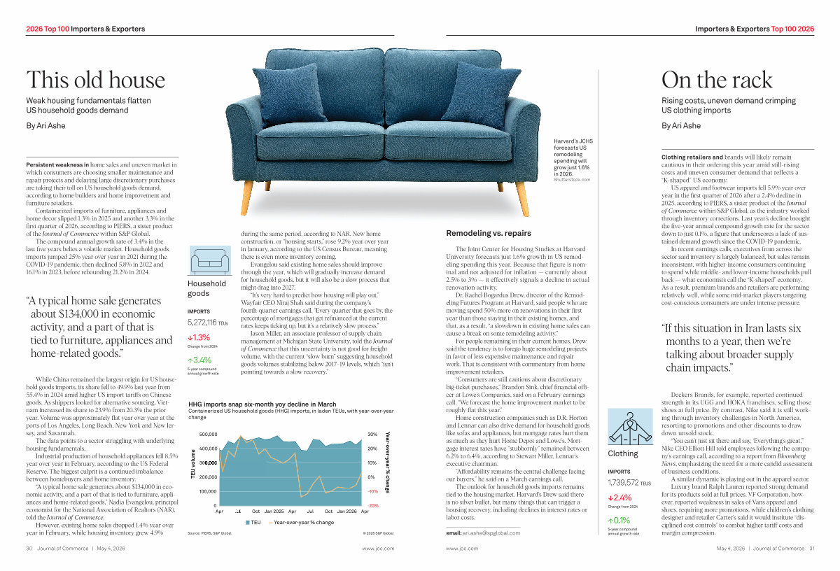 Containerized imports of furniture, appliances and home decor slipped 1.3 % in 2025 and another 3.3 % in the first quarter of 2026, according to PIERS, a sister product of the Journal of Commerce within S & P Global.
