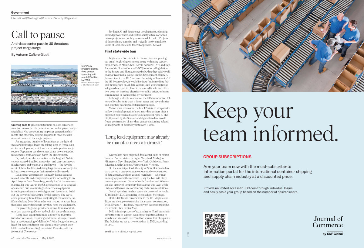 Growing calls to place moratoriums on data center construction across the US present a concern for project cargo specialists who are counting on power generation shipments and other key cargoes required to meet the enormous demands of the mega projects.