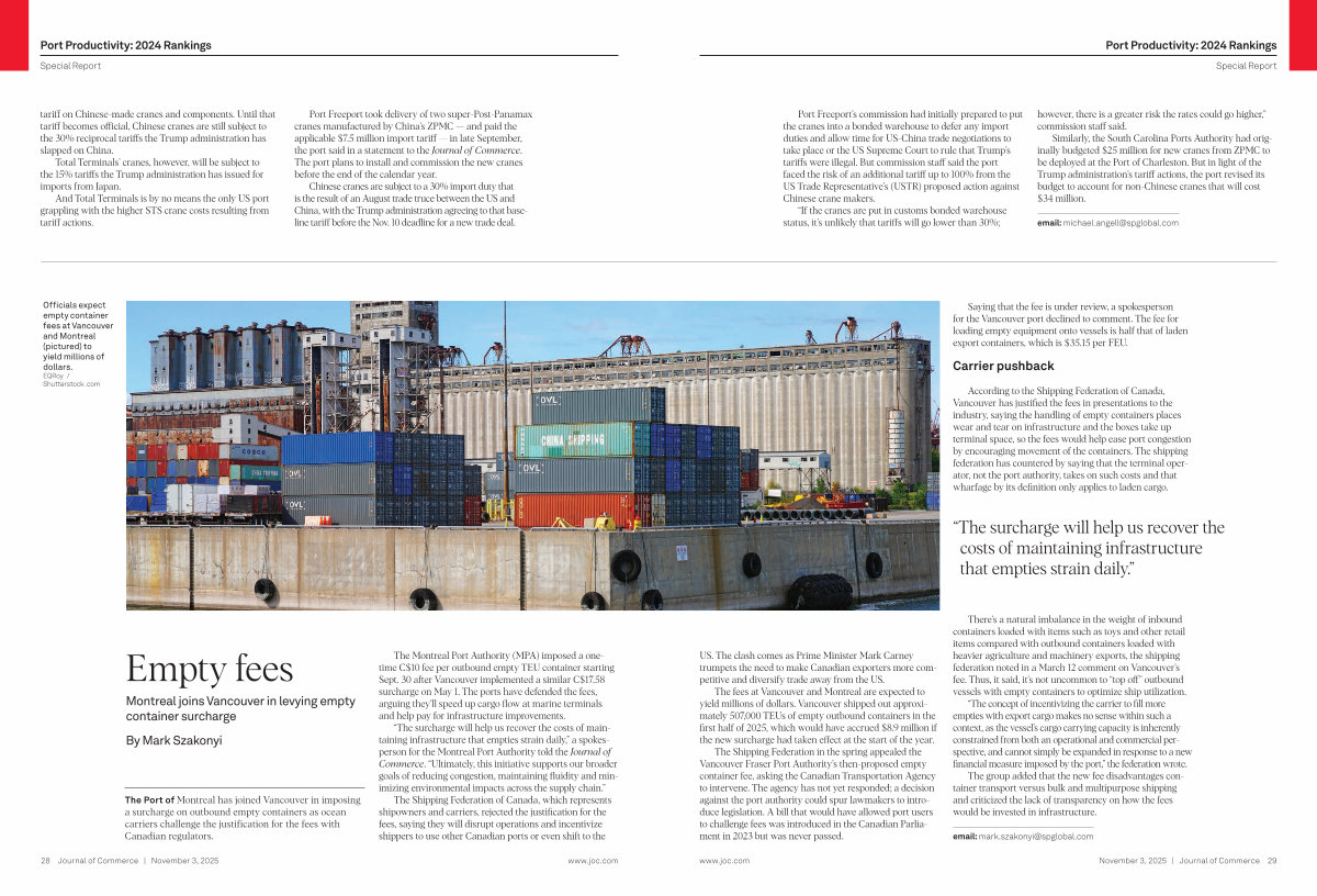 The Montreal Port Authority( MPA) imposed a onetime C $ 10 fee per outbound empty TEU container starting Sept. 30 after Vancouver implemented a similar C $ 17.58 surcharge on May 1. The ports have defended the fees, arguing they’ ll speed up cargo flow at marine terminals and help pay for infrastructure improvements.