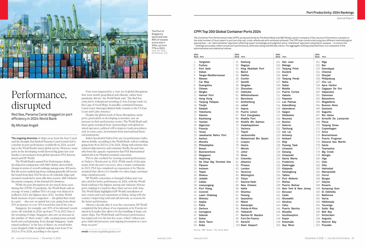 The World Bank’ s annual Port Performance Index, developed in conjunction with S & P Global, showed little change in terms of overall rankings among some 400 ports. But the scores underlying those ranking generally fell across the board from their 2023 levels as off-schedule ships and rerouted vessels led to more idle time at ports. S & P Global is the parent company of the Journal of Commerce.