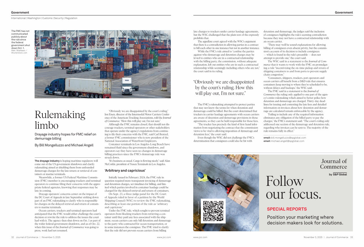 Ocean carriers, truckers and terminal operators had anticipated that the FMC would either challenge the court’ s decision or rewrite the rule to address the issues the court had with it. The agency then shut down on Oct. 1 as part of the wider federal government shutdown, and as of Oct. 22, when this issue of the Journal of Commerce was going to press, work had not resumed.