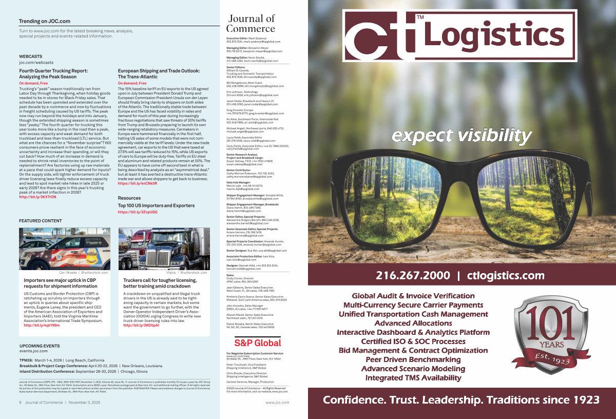 Journal of Commerce( USPS 279 – 060), ISSN 1530-7557, November 3, 2025, Volume 26, Issue No. 11. Journal of Commerce is published monthly( 12 issues a year) by JOC Group Inc., 55 Water St., 39th Floor, New York, N. Y. 10041. Subscription price: $ 595 a year. Periodicals postage paid at New York, N. Y., and additional mailing offices. © All rights reserved. No portion of this publication may be copied or reprinted without written permission from the publisher. POSTMASTER: Please send address changes to Journal of Commerce, Subscription Services Department, 55 Water St., 39th Floor, New York, N. Y. 10041.