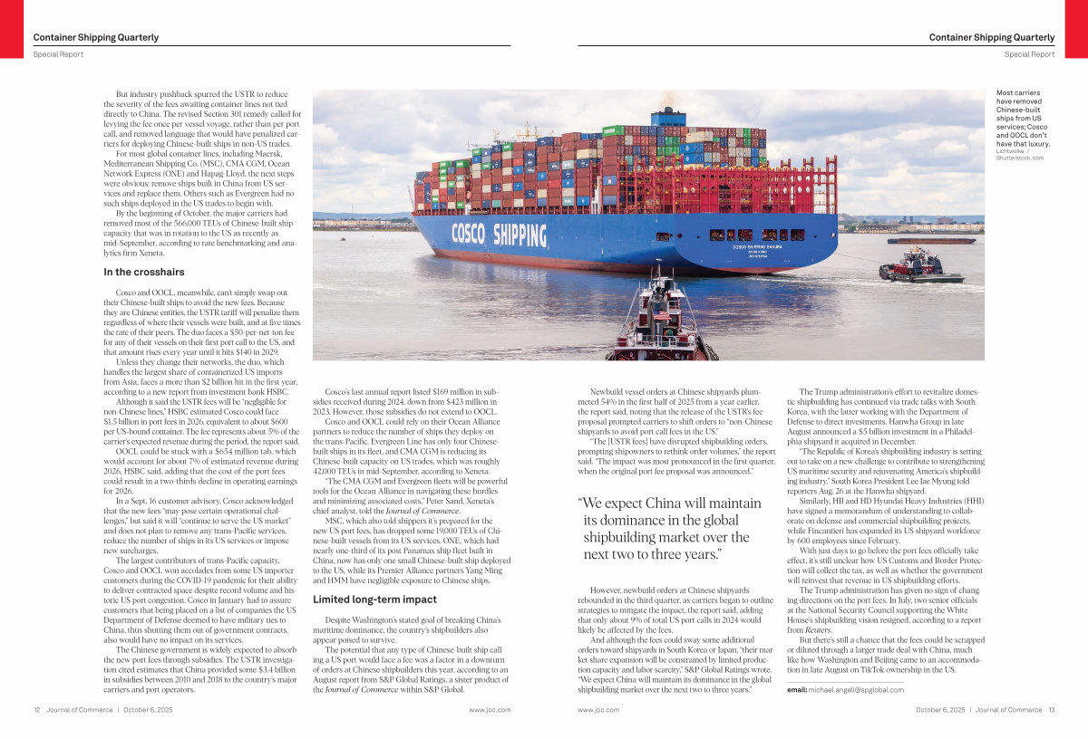 The potential that any type of Chinese-built ship calling a US port would face a fee was a factor in a downturn of orders at Chinese shipbuilders this year, according to an August report from S & P Global Ratings, a sister product of the Journal of Commerce within S & P Global.