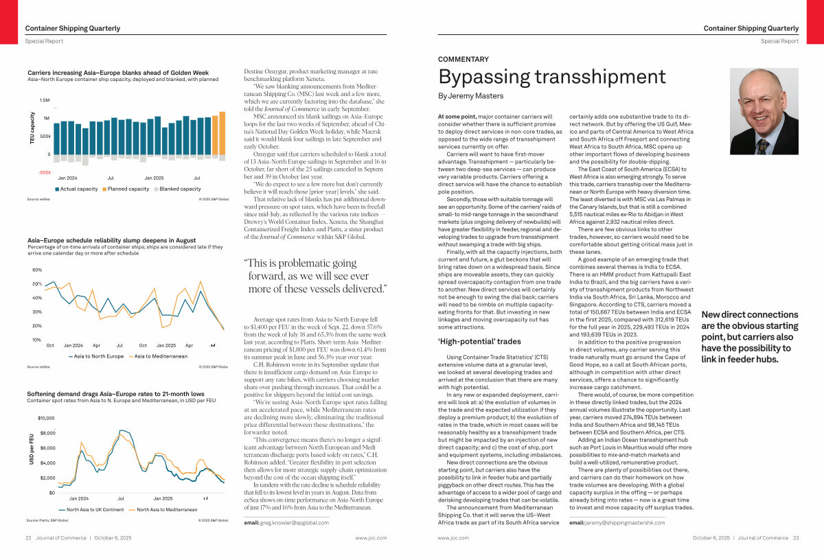 Finally, with all the capacity injections, both current and future, a glut beckons that will bring rates down on a widespread basis. Since ships are moveable assets, they can quickly spread overcapacity contagion from one trade to another. New direct services will certainly not be enough to swing the dial back; carriers will need to be nimble on multiple capacityeating fronts for that. But investing in new linkages and moving overcapacity out has some attractions.