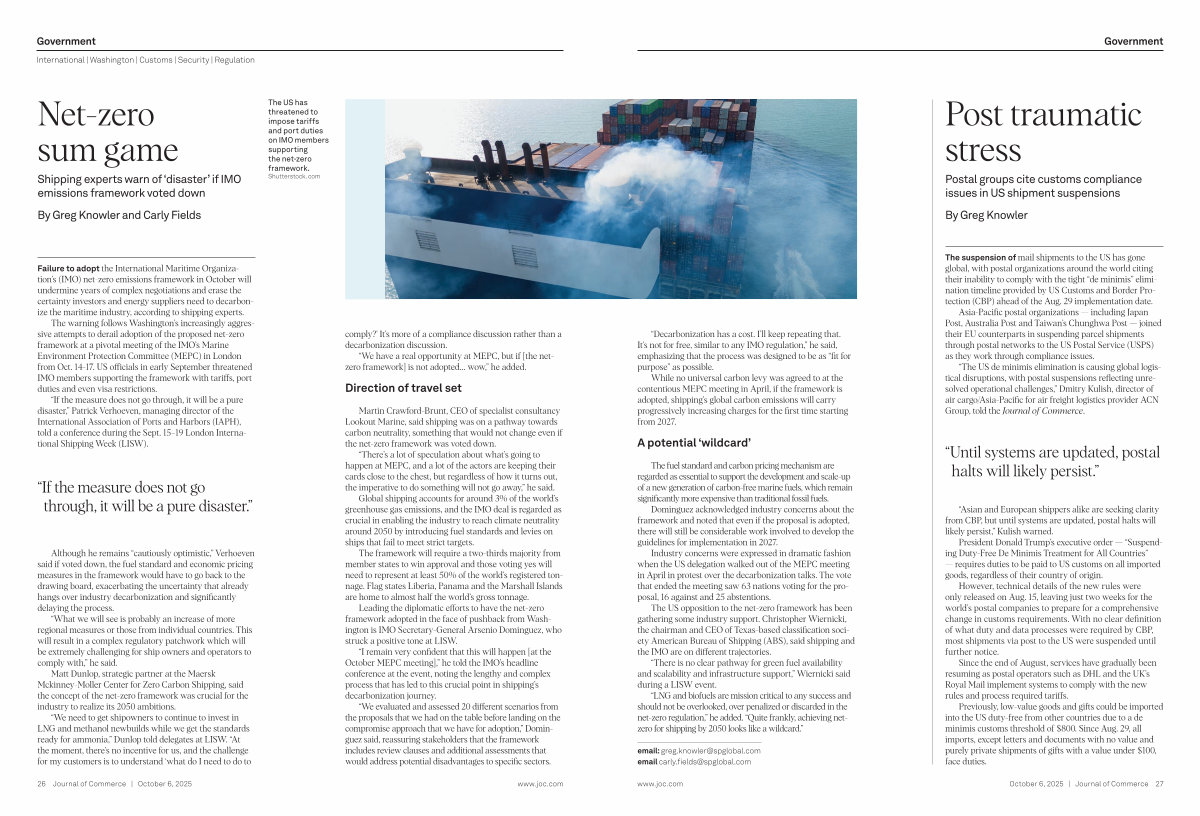 The warning follows Washington’ s increasingly aggressive attempts to derail adoption of the proposed net-zero framework at a pivotal meeting of the IMO’ s Marine Environment Protection Committee( MEPC) in London from Oct. 14-17. US officials in early September threatened IMO members supporting the framework with tariffs, port duties and even visa restrictions.
