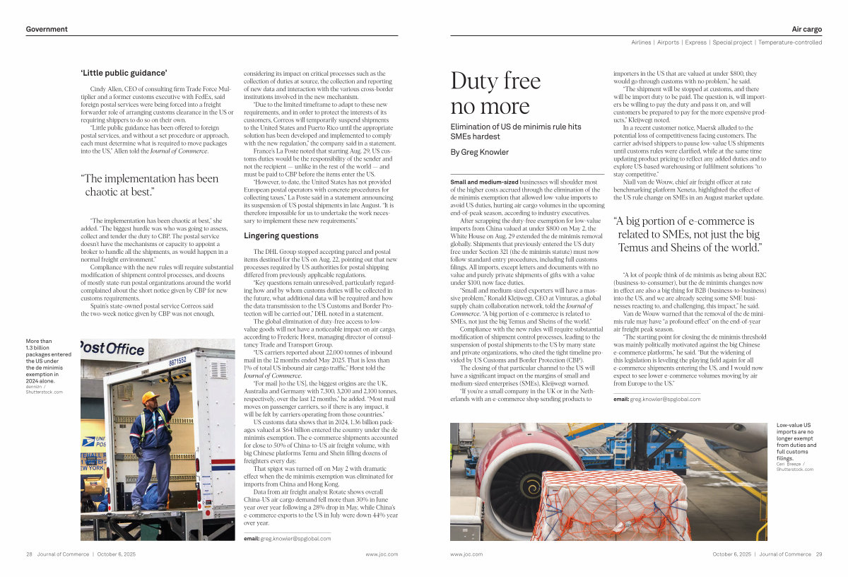Low-value US imports are no longer exempt from duties and full customs filings. Ceri Breeze / Shutterstock. com www. joc. com October 6, 2025 | Journal of Commerce 29