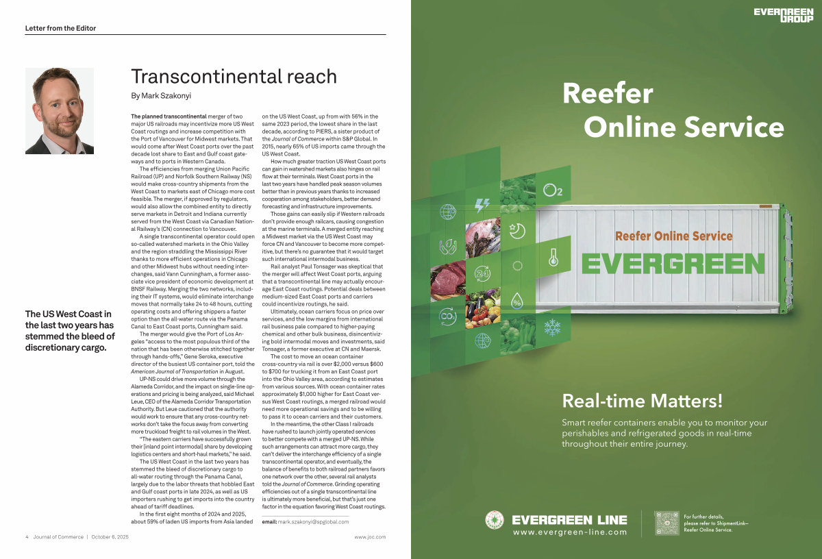 Rail analyst Paul Tonsager was skeptical that the merger will affect West Coast ports, arguing that a transcontinental line may actually encourage East Coast routings. Potential deals between medium-sized East Coast ports and carriers could incentivize routings, he said.