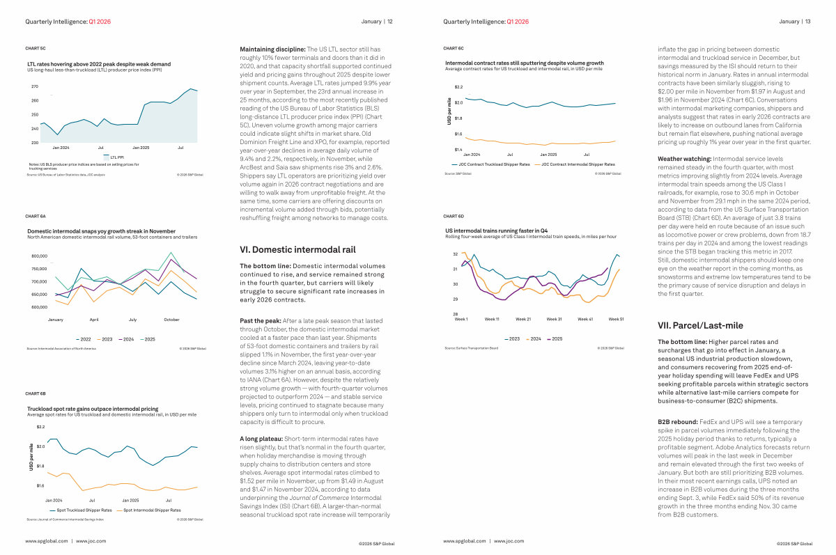 A long plateau: Short-term intermodal rates have risen slightly, but that’ s normal in the fourth quarter, when holiday merchandise is moving through supply chains to distribution centers and store shelves. Average spot intermodal rates climbed to $ 1.52 per mile in November, up from $ 1.49 in August and $ 1.47 in November 2024, according to data underpinning the Journal of Commerce Intermodal Savings Index( ISI)( Chart 6B). A larger-than-normal seasonal truckload spot rate increase will temporarily www. spglobal. com | www. joc. com © 2026 S & P Global