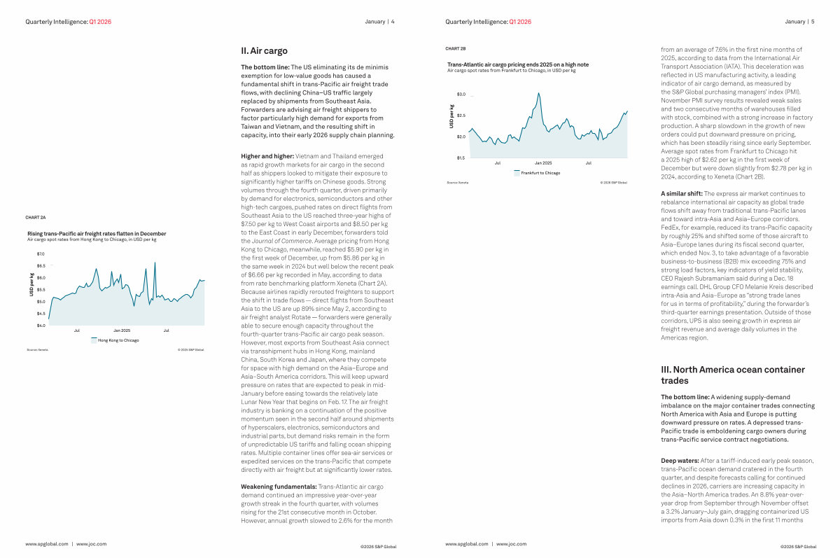 Weakening fundamentals: Trans-Atlantic air cargo demand continued an impressive year-over-year growth streak in the fourth quarter, with volumes rising for the 21st consecutive month in October. However, annual growth slowed to 2.6 % for the month www. spglobal. com | www. joc. com © 2026 S & P Global